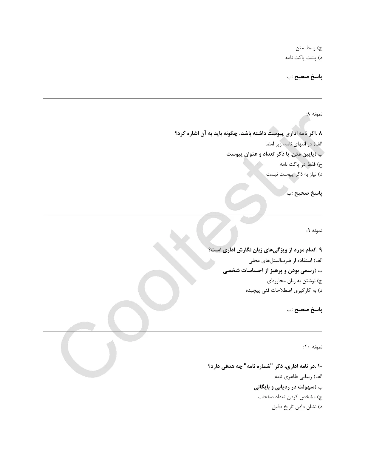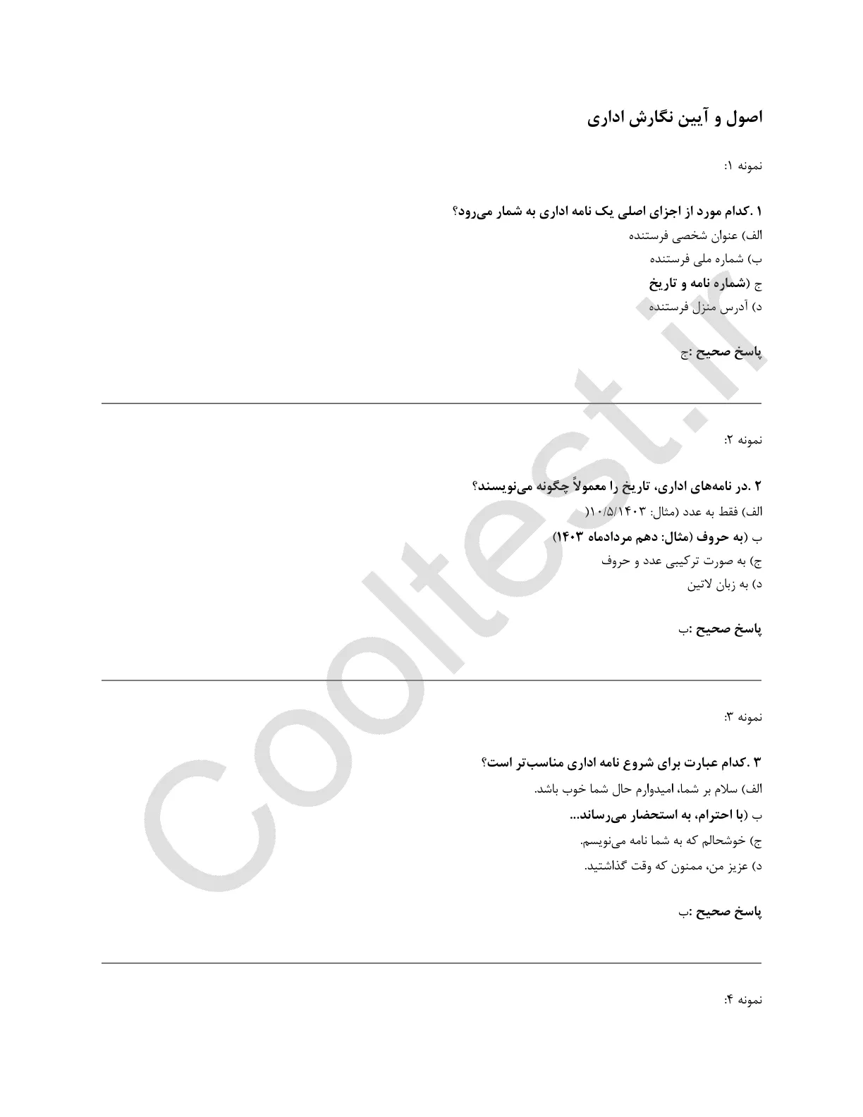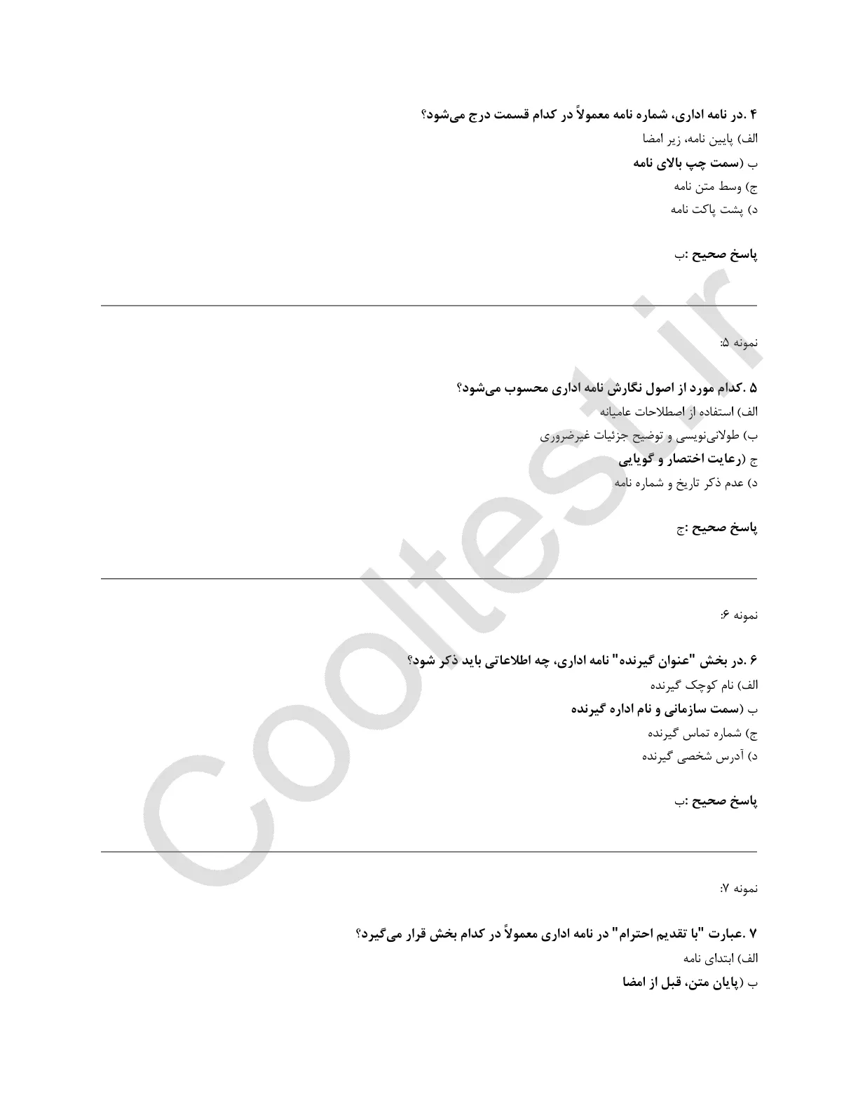 نمونه سوالات بکارگیری آیین نگارش و مکاتبات اداری