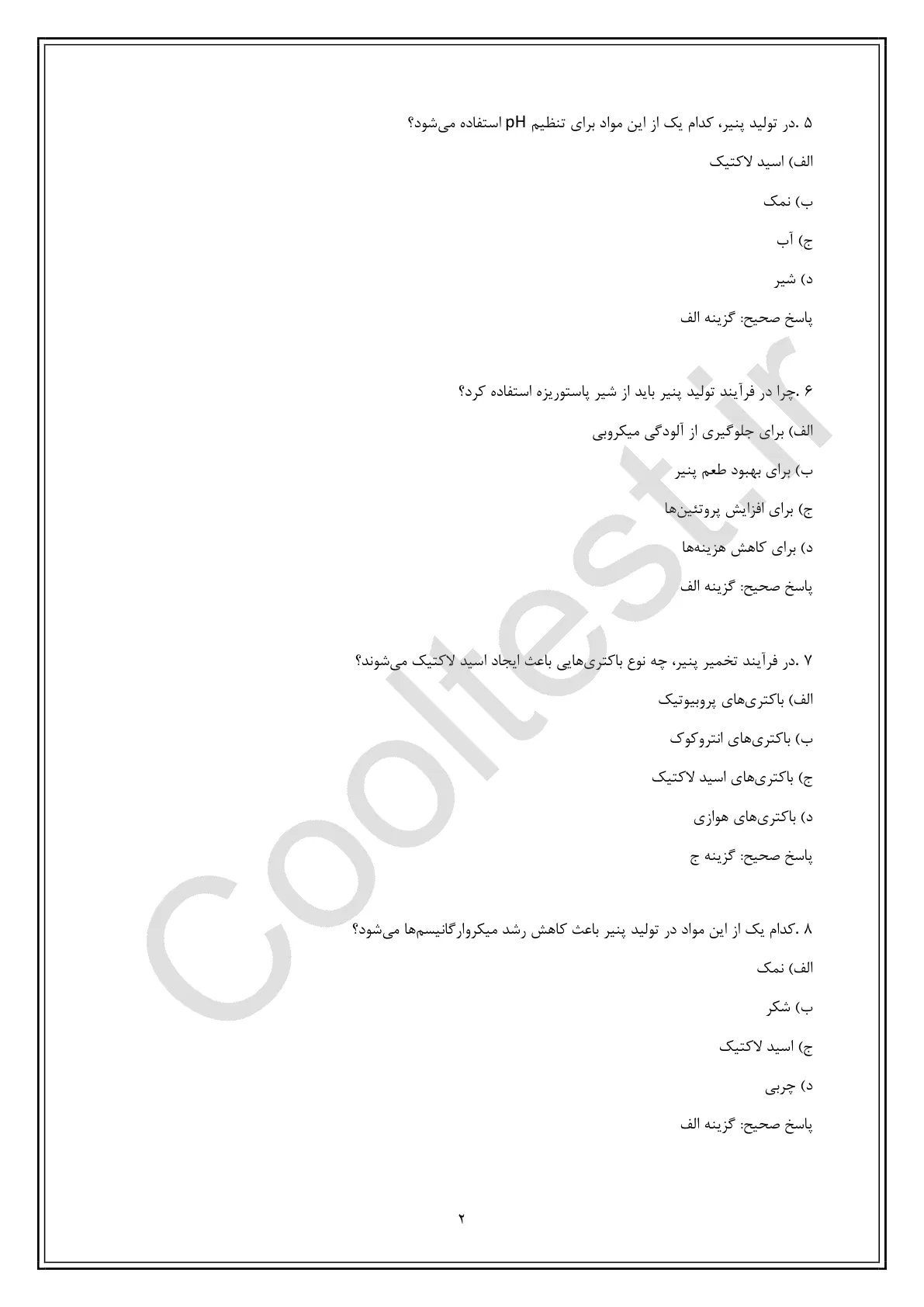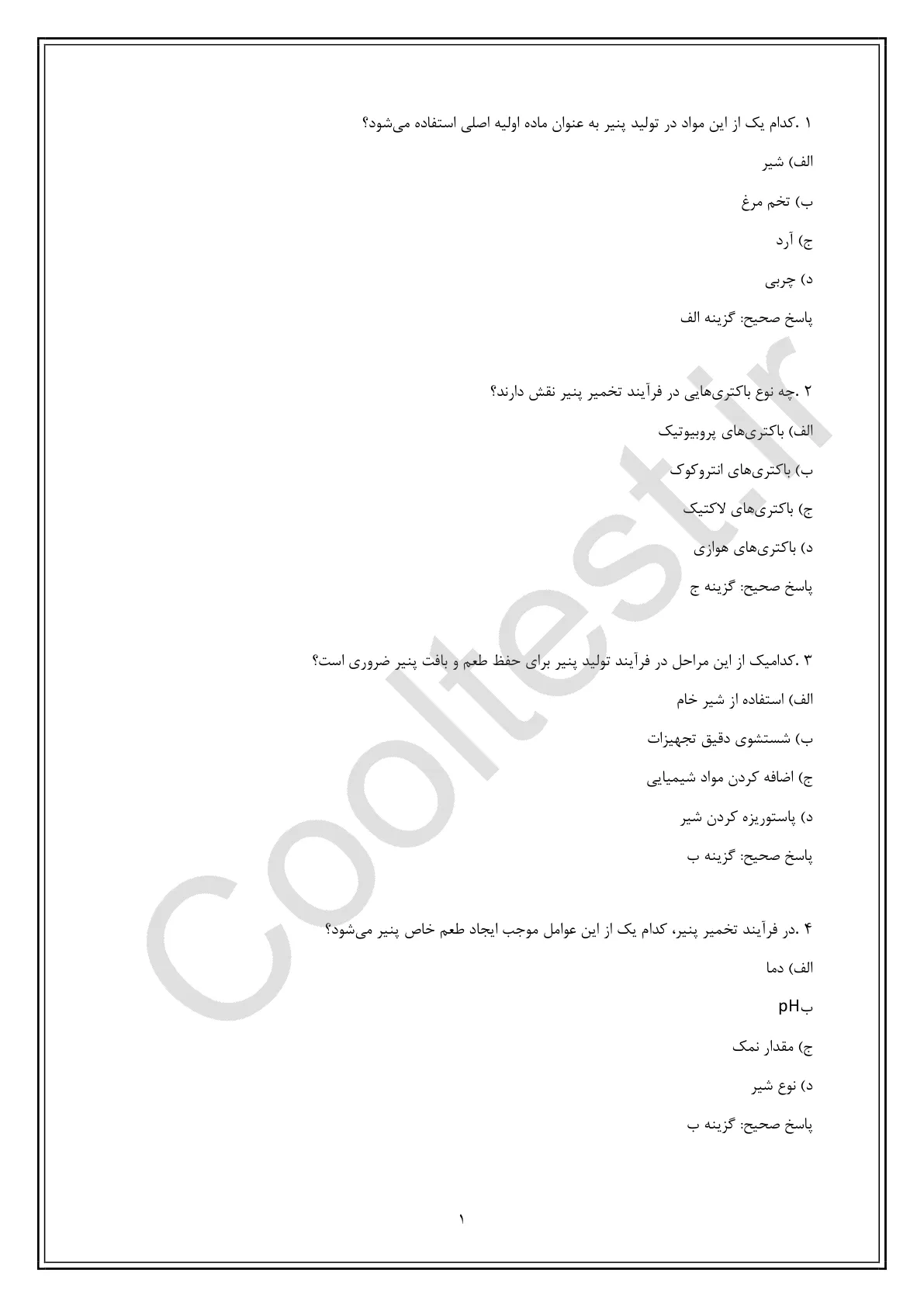 تولید فرآوردههای تخمیری پنیر نیازمند رعایت استانداردهای قانونی و صنعتی است. سوالات این بخش شامل: