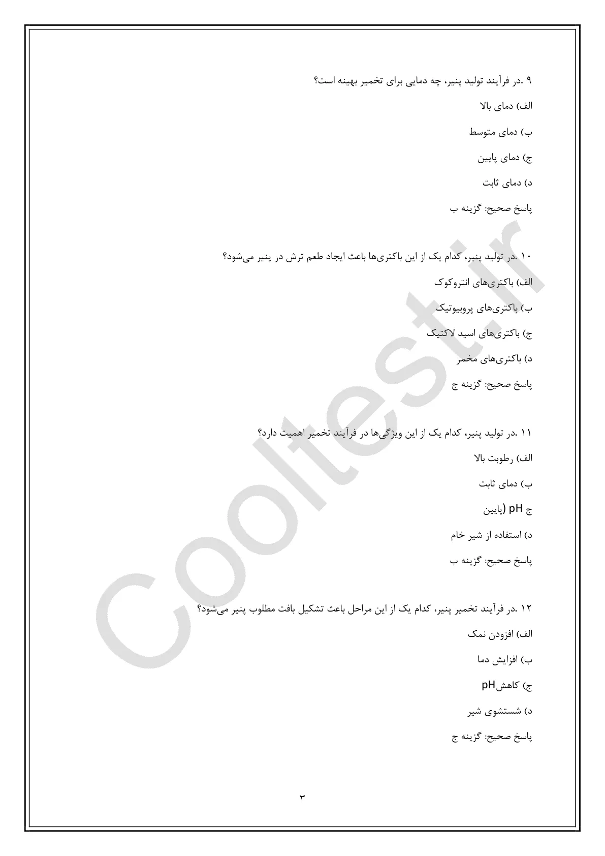 در فرآیند تولید فرآوردههای تخمیری پنیر، انتخاب مواد اولیه با کیفیت و اجرای صحیح فرآیند تخمیر بسیار مهم است. در این بخش، سوالاتی درباره: