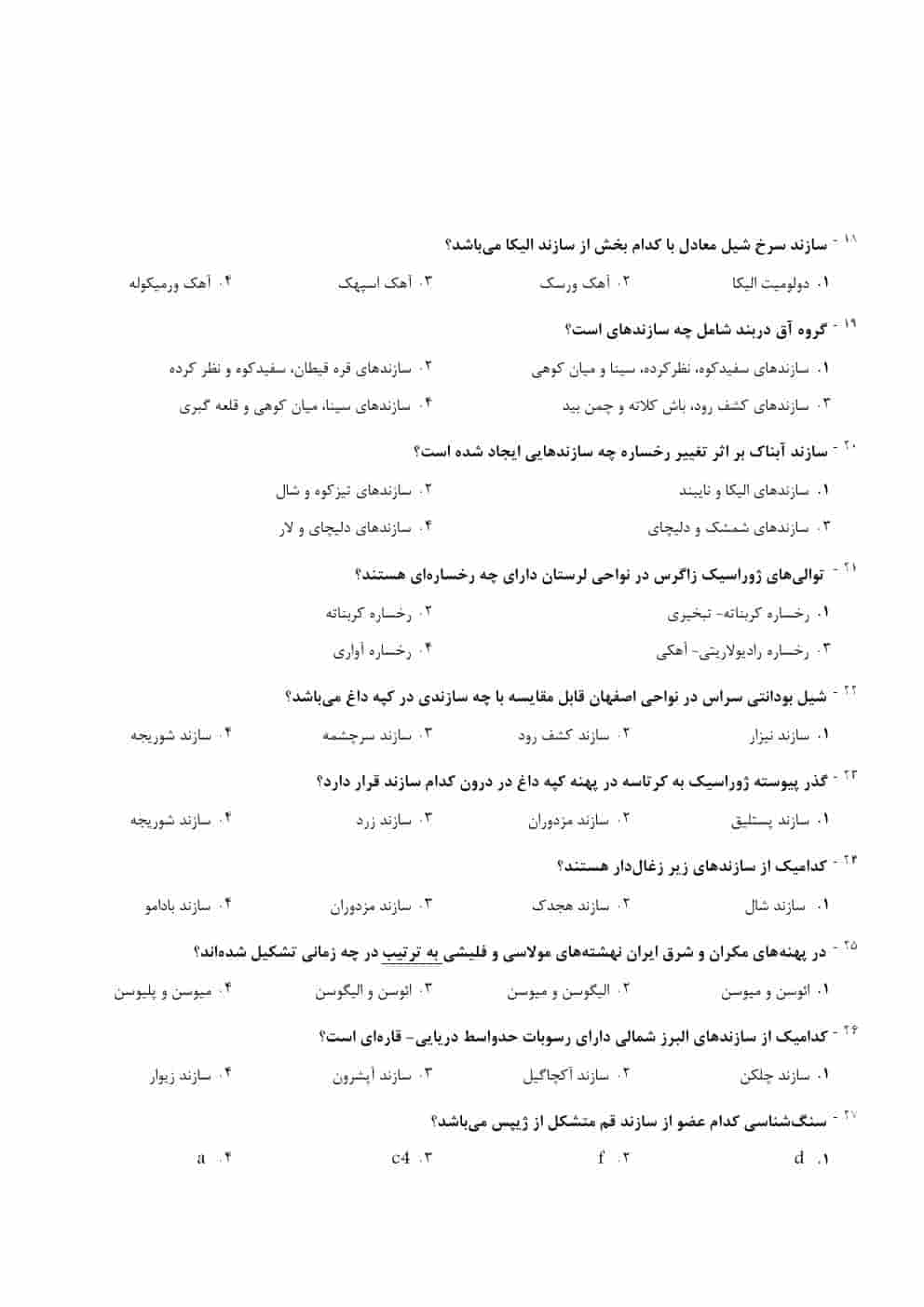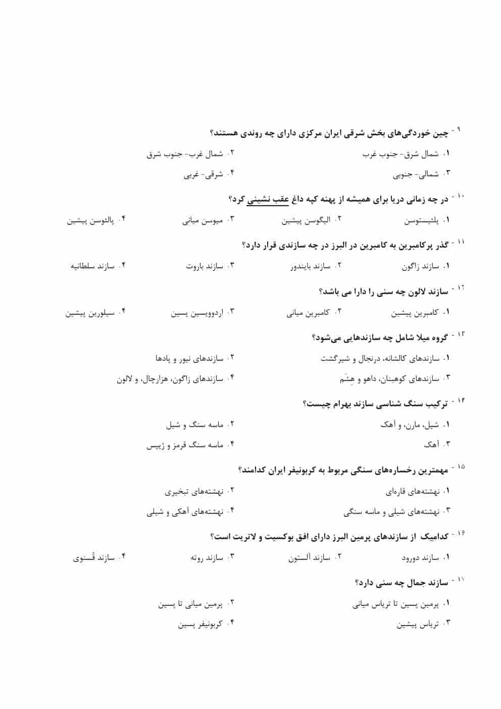 این بخش شامل سوالاتی است که به مباحث زمین‌شناسی ایران، ساختارهای زمین‌شناسی ایران و تاریخچه زمین‌شناسی این کشور می‌پردازد. پاسخنامه‌های دقیق این سوالات به شما کمک می‌کنند تا به طور کامل بر این مباحث مسلط شوید.