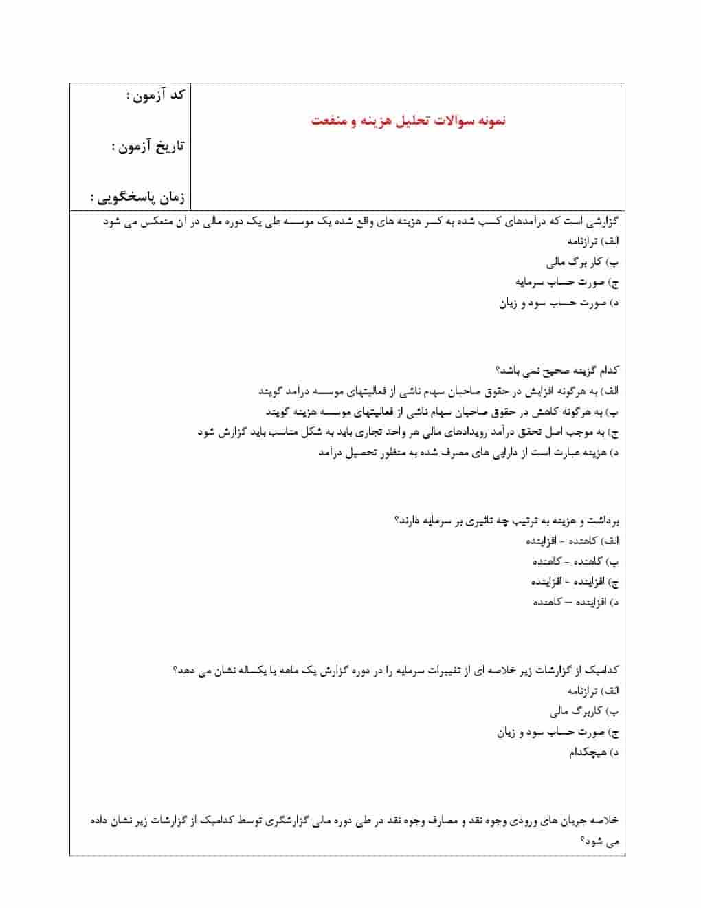 (بزرگترین مجموعه سوالات تحلیل هزینه و منفعت غلامرضا بداقی در اینترنت)