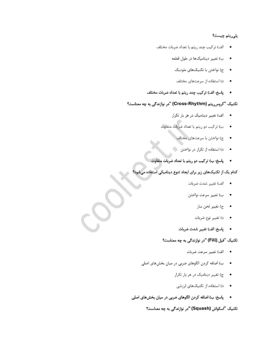 • مطالب کاربردی: سوالات بر اساس مباحث کلیدی و مهم نوازندگی ساز کوبه ای پرکاشن تنظیم شده‌ اند.