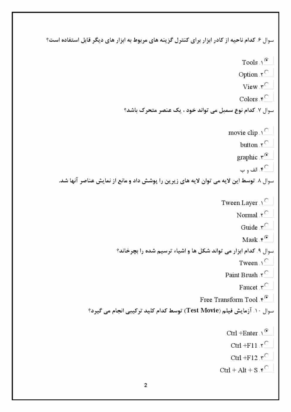 | فصل 4: انیمیشنسازی و اصول انیمیشن | سوالاتی که به بررسی مبانی انیمیشنسازی و تکنیکهای مورد استفاده در Flash MX میپردازند. |