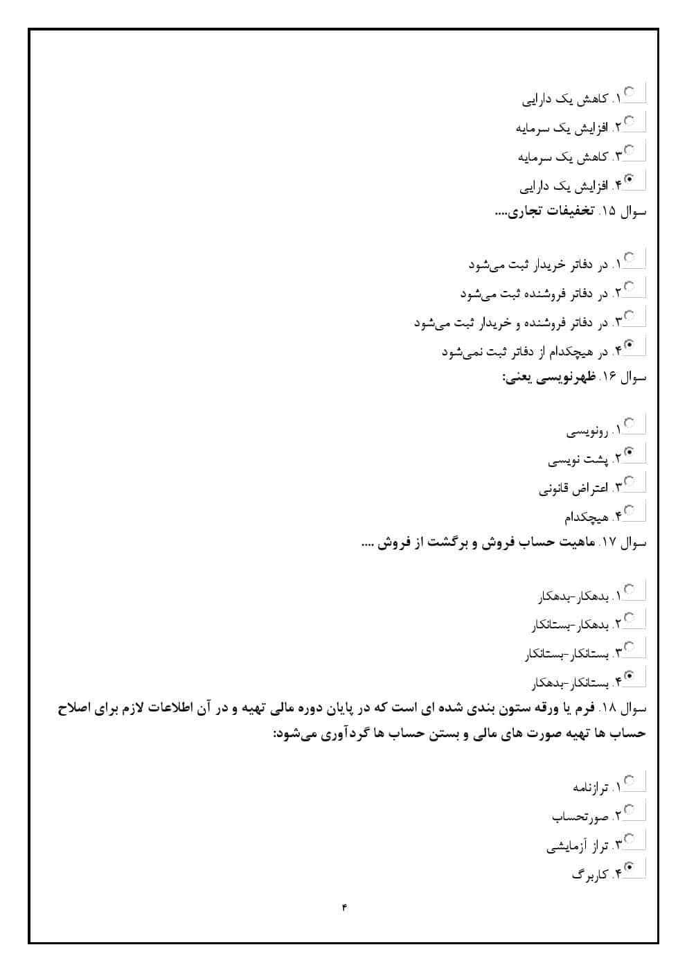 | فصل ۴: حسابداری حقوق و دستمزد | سوالاتی در مورد محاسبه حقوق و دستمزد، مزایا، کسورات و ثبتهای مربوطه در دفاتر حسابداری |