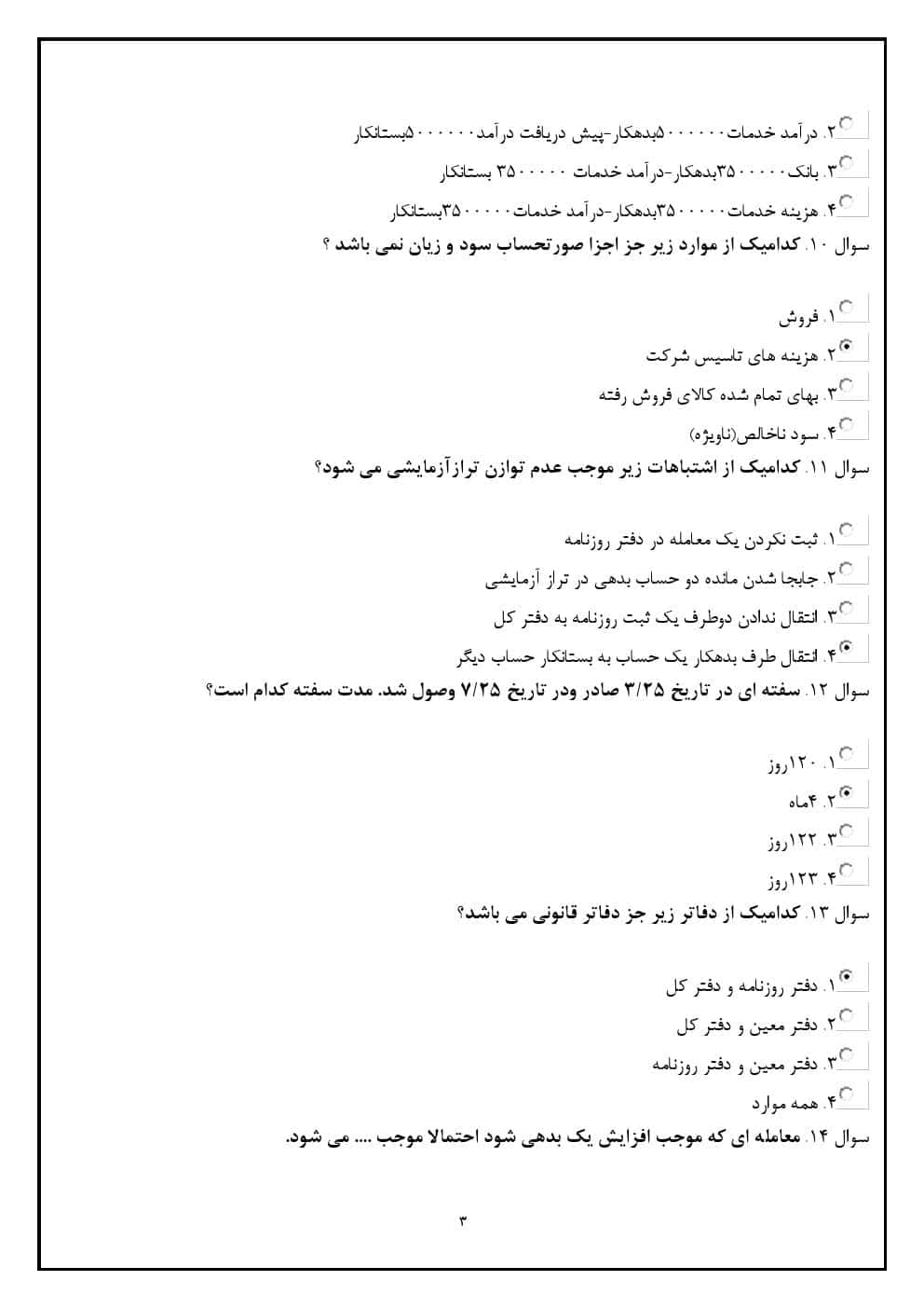 | فصل ۳: ثبت های حسابداری | سوالاتی در مورد نحوه ثبت اسناد حسابداری، بدهکاری و بستانکاری، و تنظیم ترازنامه |