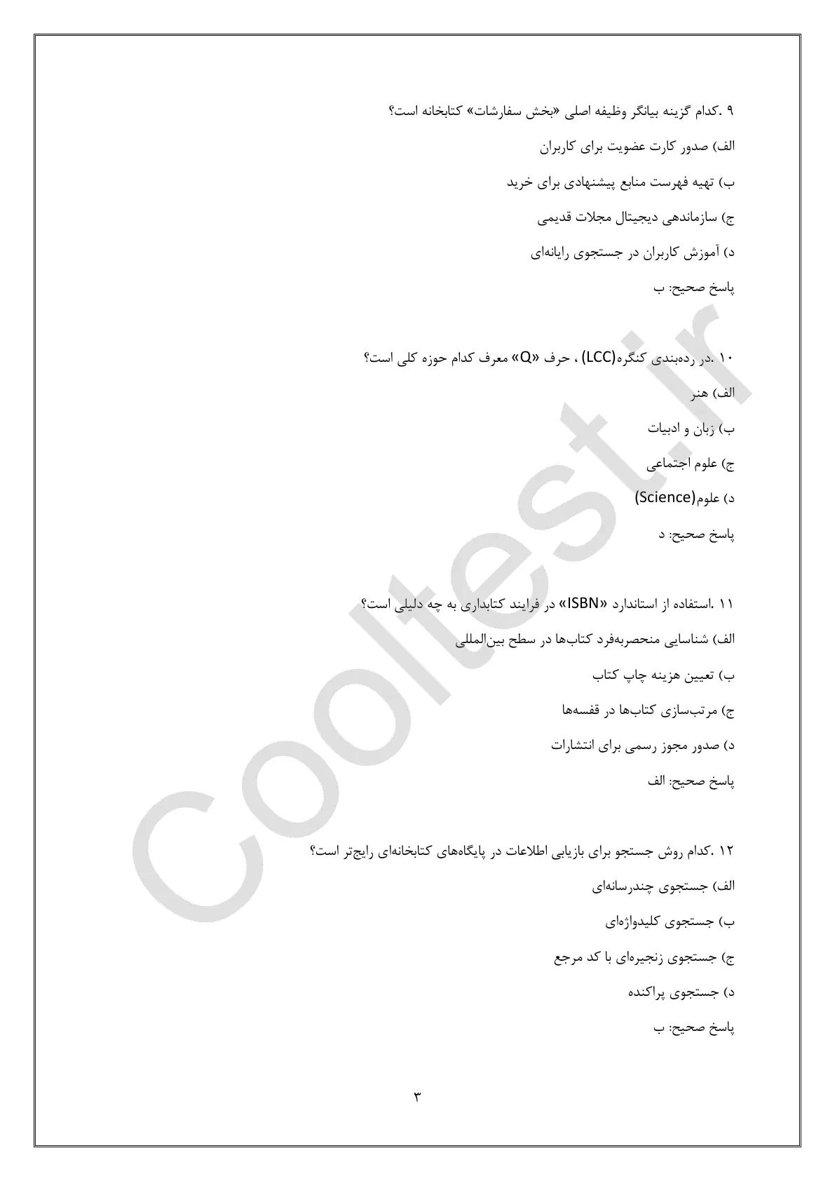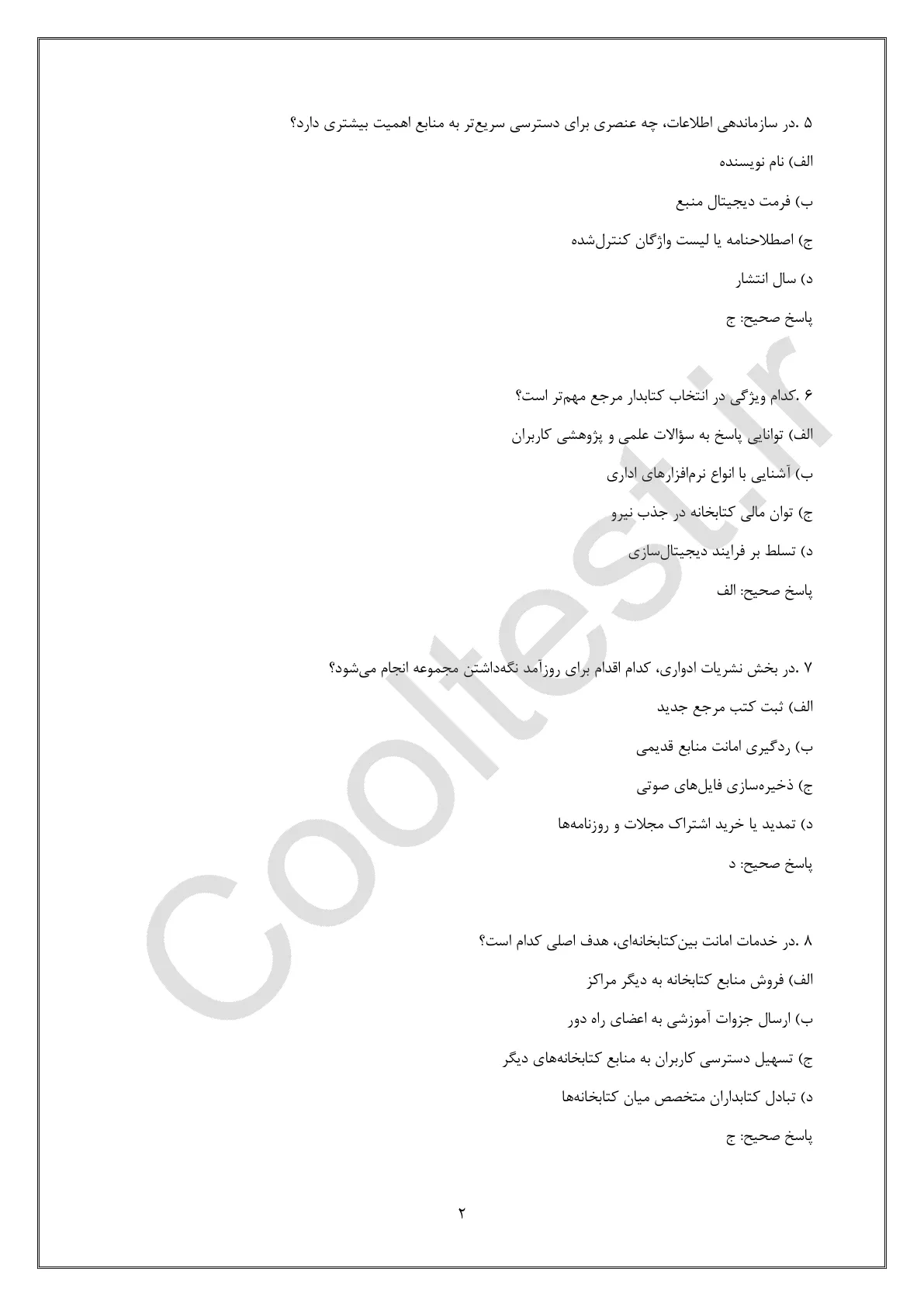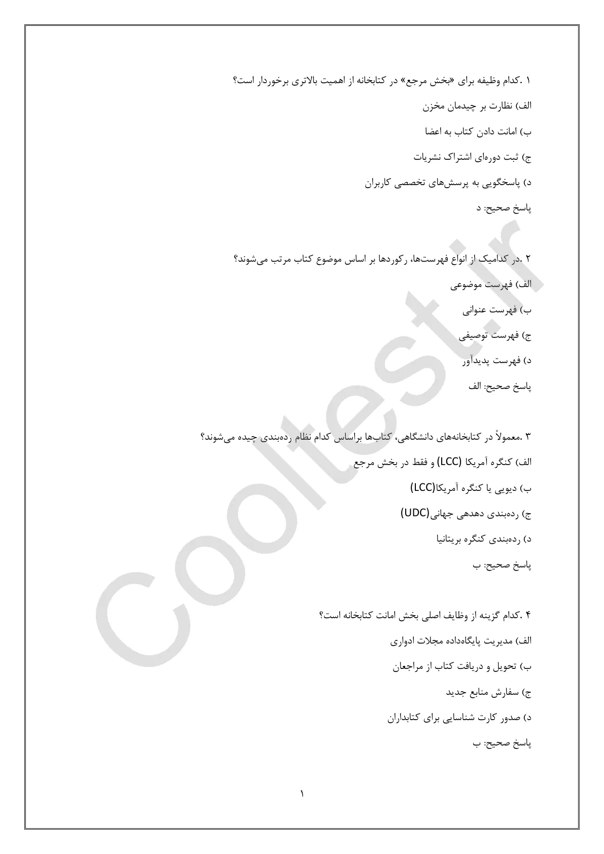 سوالات رایگان استخدامی کتابداری در اینترنت یافت میشود، اما معمولاً ناقص هستند و کاربردی نیستند. میتوانید سوالات کامل را از سایت کول تست دانلود کنید.