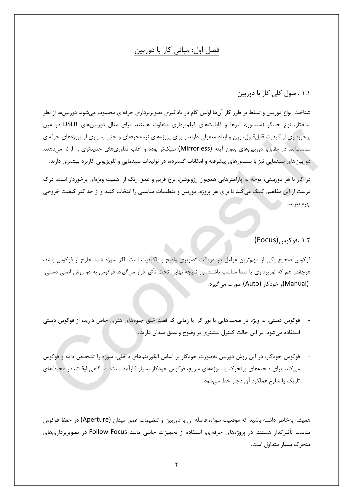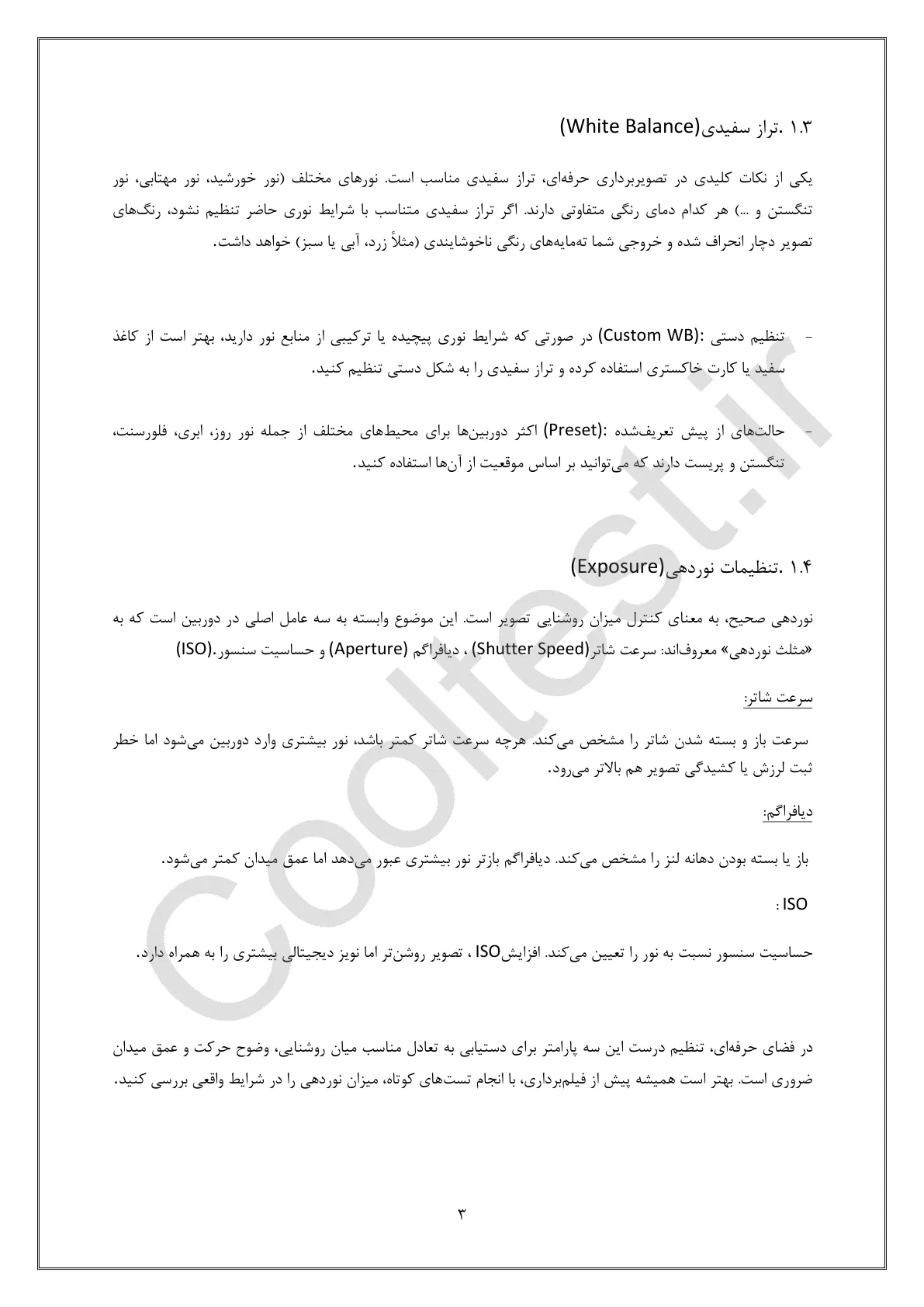 فصل اول: تنظیم دوربین سوالاتی درباره اصول کار با دوربین، فوکوس، تراز سفیدی و تنظیمات نوردهی.