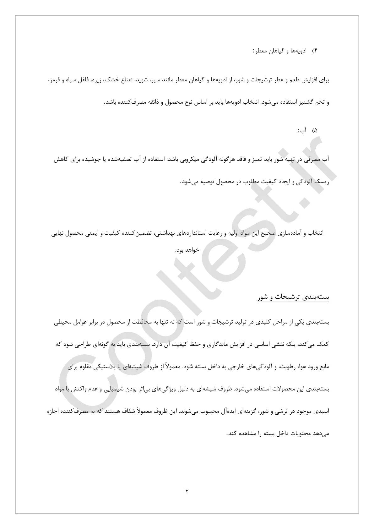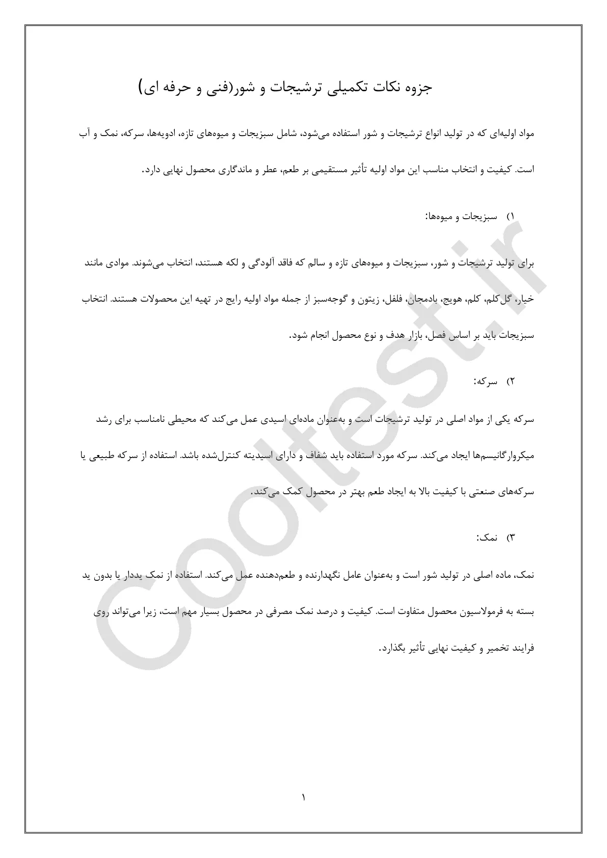| مواد اولیه و فرآیند تولید | سوالاتی درباره انتخاب مواد اولیه و فرآیند تهیه ترشی و شور. |