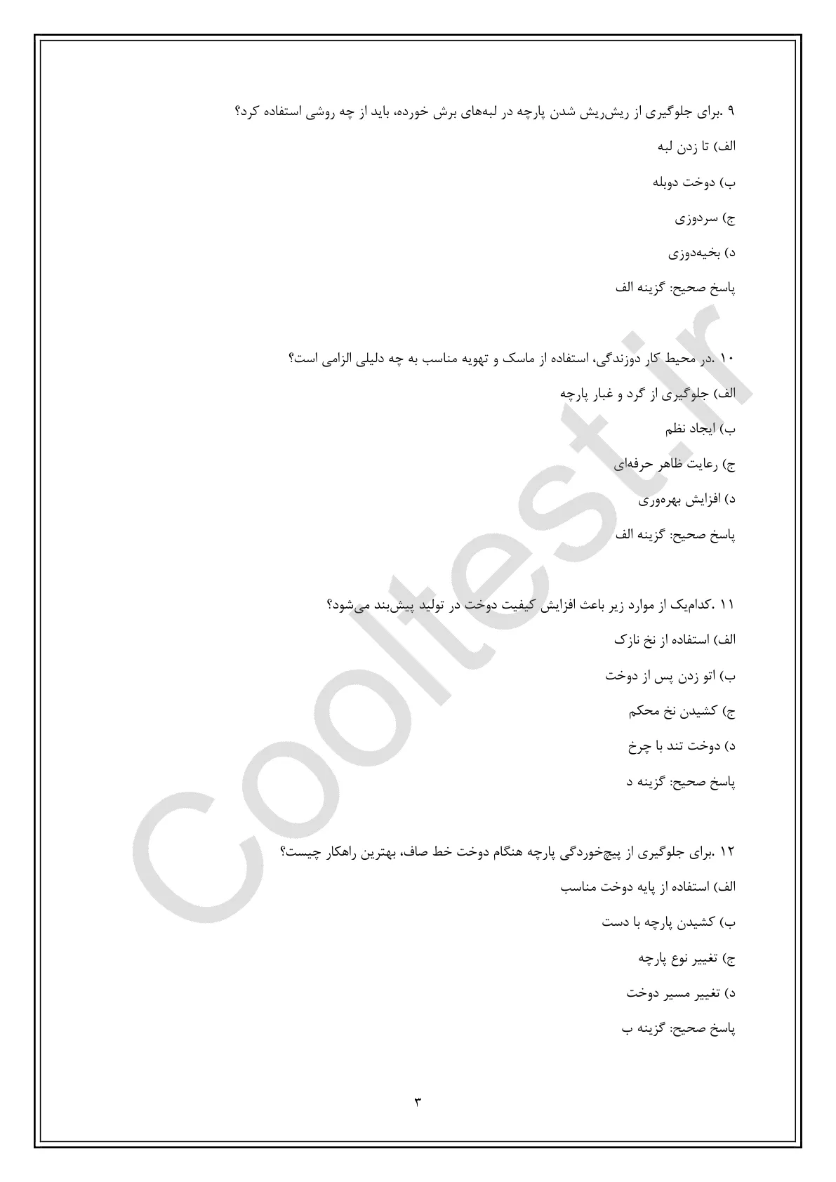 نمونه سوالات روپوش و ربدوشامبر دوز، کت و پیژام، سربند و پیش بند 1404 بهصورت کامل و جامع از سایت کول تست تهیه شدهاند. این مجموعه شامل ۲۵۰ سوال به همراه پاسخهای تشریحی است که به شما در آمادگی برای آزمونهای مرتبط با مهارتهای دوزندگی و تولید پوشاک کمک میکند. موضوعات پوشش داده شده شامل مبانی دوزندگی، تکنیکهای پیشرفته دوخت و الحاق، شناخت انواع پارچهها و الگوهای پوشاک، اصول ایمنی و بهداشت در محیط کار، و مدیریت زمان و برنامهریزی در کارگاههای دوزندگی میباشد. با مطالعه این سوالات، میتوانید دانش و مهارتهای خود را ارزیابی کرده و به بهترین شکل برای آزمون آماده شوید.