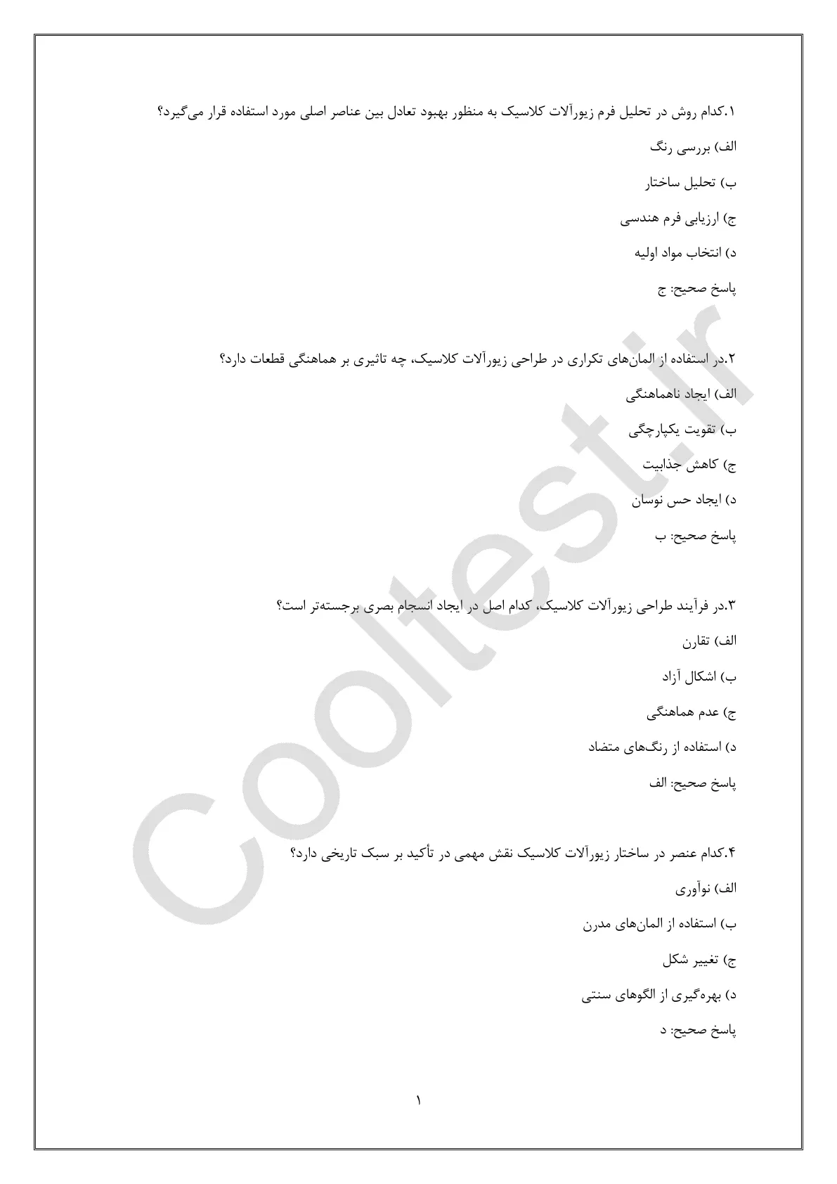 در اینترنت سوالات رایگان برای آزمون طراح زیورآلات کلاسیک موجود است، اما این سوالات معمولاً ناقص هستند. برای دسترسی به بسته کامل و جامع ۲۵۰ سوال تستی همراه با پاسخنامه، این مجموعه بهترین گزینه است.