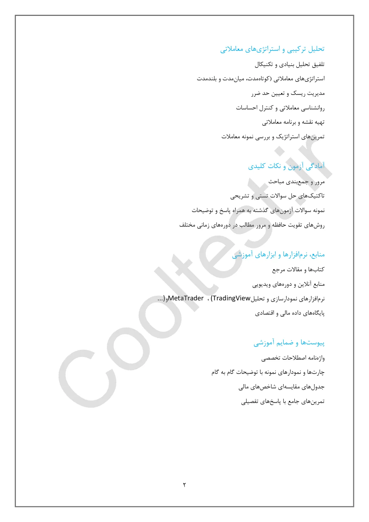 | ۴. مدیریت ریسک و بازده در معاملات | ۵۰ سوال | نحوه محاسبه ریسک در معاملات و مدیریت صحیح ریسک برای کسب سود. |