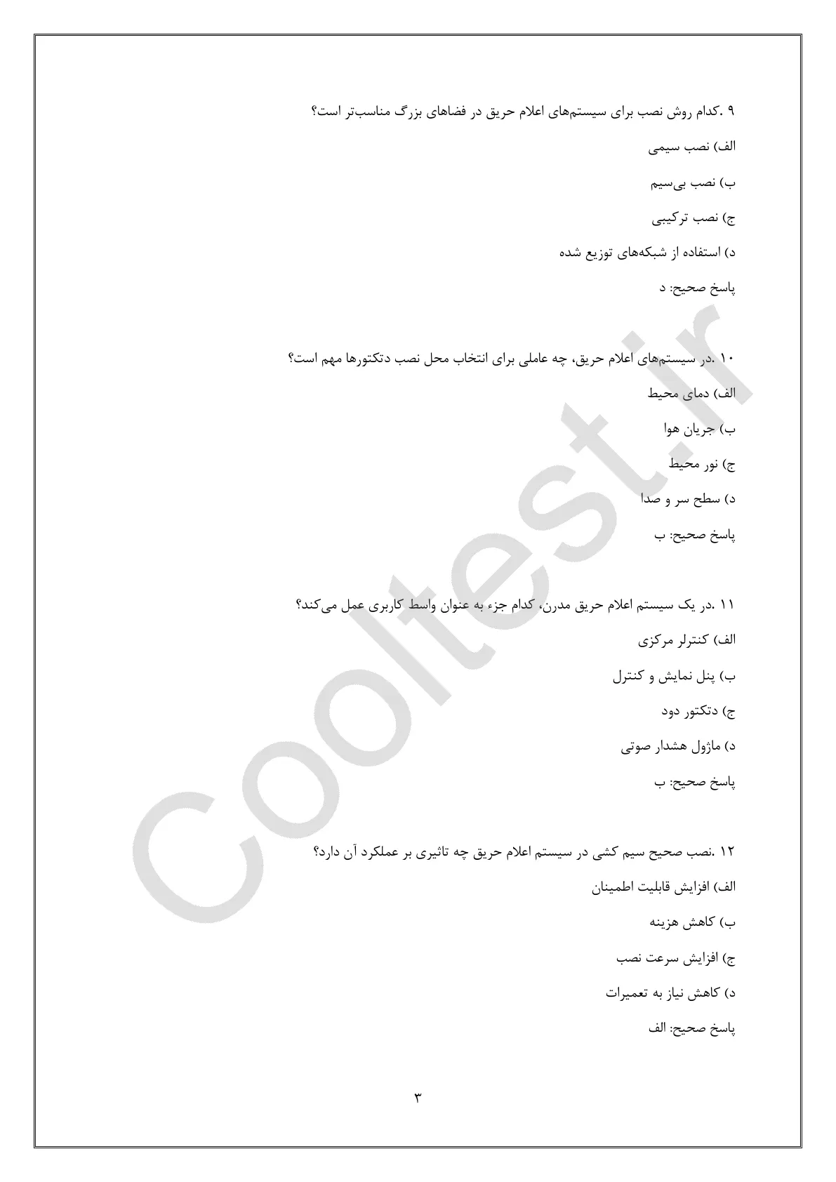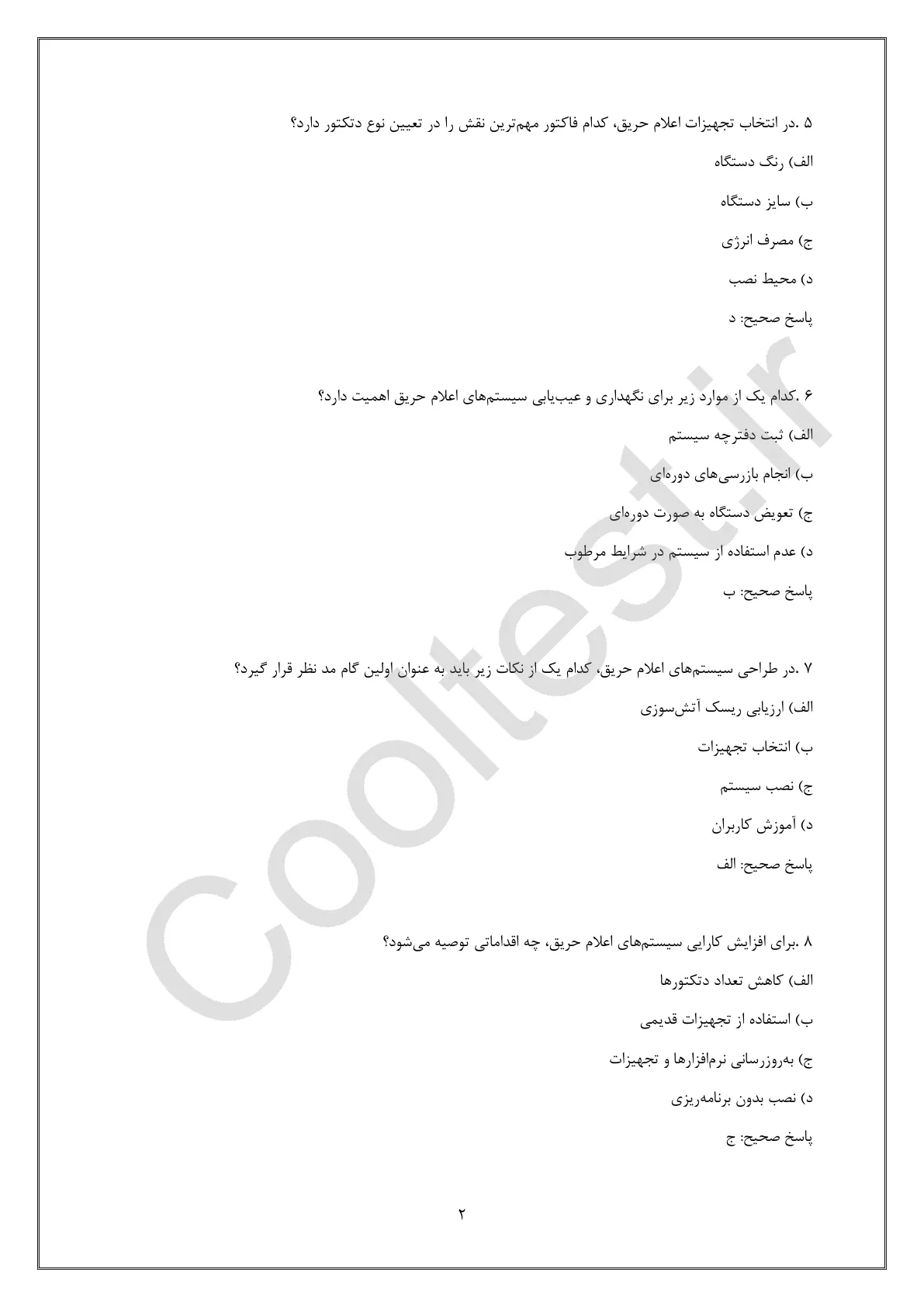نمونه سوالات نصب سیستم های اعلام حریق 1404 بصورت کامل و جامع از سایت کول تست تهیه شدهاند. این مجموعه شامل ۳۵۰ سوال به همراه پاسخ های تشریحی است که به شما در آمادگی برای آزمونهای مرتبط با مهارتهای نصب و نگهداری سیستمهای اعلام حریق کمک میکند. موضوعات پوشش داده شده شامل مبانی سیستمهای اعلام حریق، انواع و کاربردهای تجهیزات اعلام حریق، اصول ایمنی و بهداشت در نصب سیستمهای اعلام حریق، عیبیابی و تعمیر تجهیزات، و مدیریت پروژههای نصب سیستمهای اعلام حریق میباشد. با مطالعه این سوالات، میتوانید دانش و مهارتهای خود را ارزیابی کرده و به بهترین شکل برای آزمون آماده شوید.