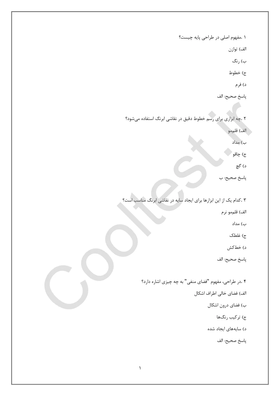| طراحی اولیه | سوالاتی درباره مفاهیم پایه طراحی نقاشی آبرنگ، ابزارهای اولیه و نحوه کار با خطوط و سایه ها |