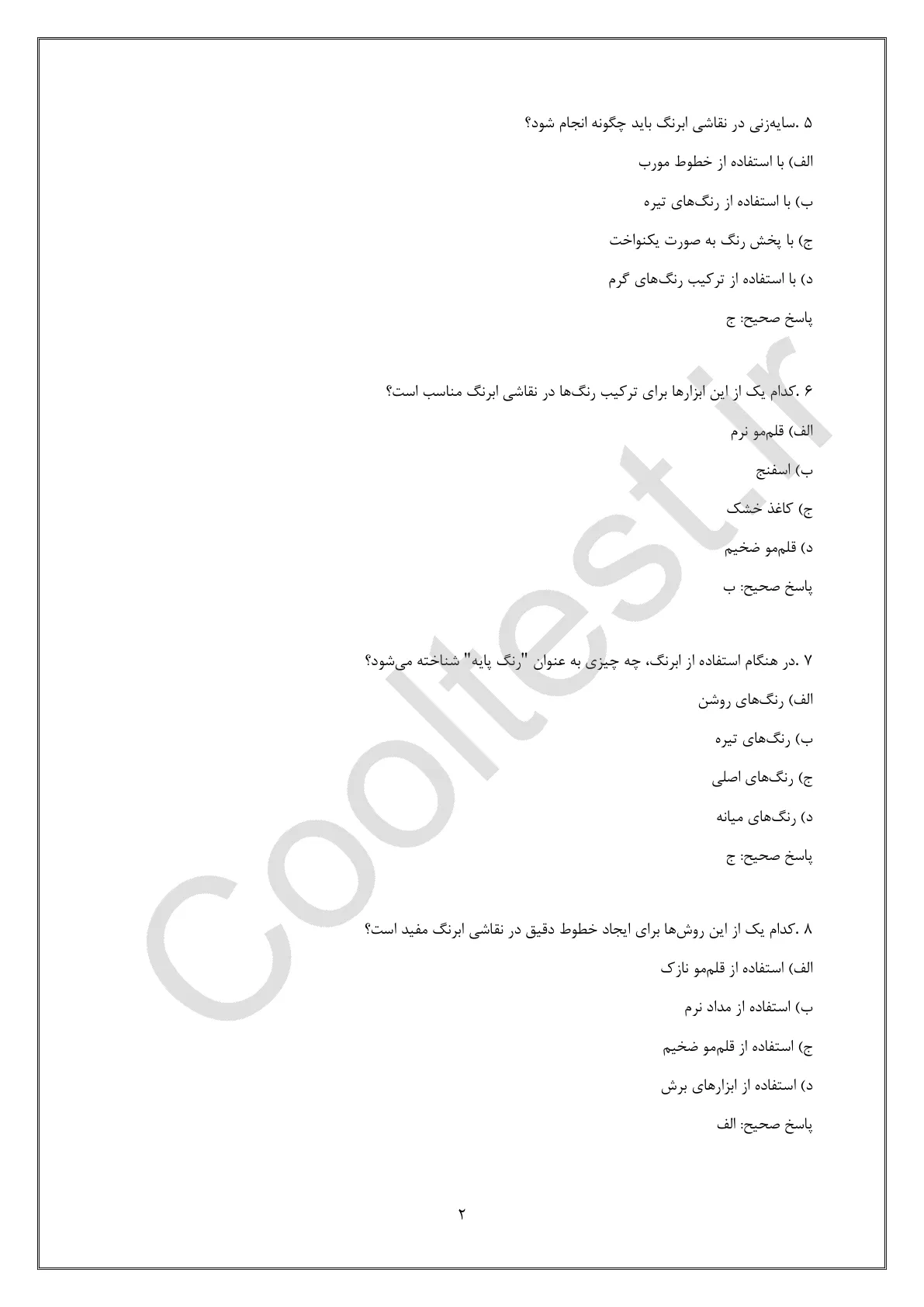 | آزمونهای آزمایشی و عملی | سوالات نقاشی آبرنگ شبیه سازی شده آزمون فنی حرفه ای برای تمرین و سنجش آمادگی. |