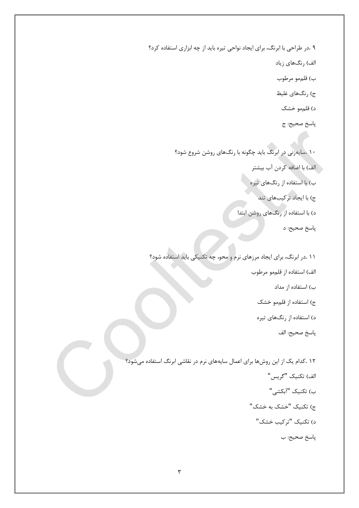 | تکنیکهای ویژه نقاشی | سوالات در خصوص استفاده از قلم فلزی، آب مرکب، اکولین و تلفیق تکنیک ها در نقاشی آبرنگ |
