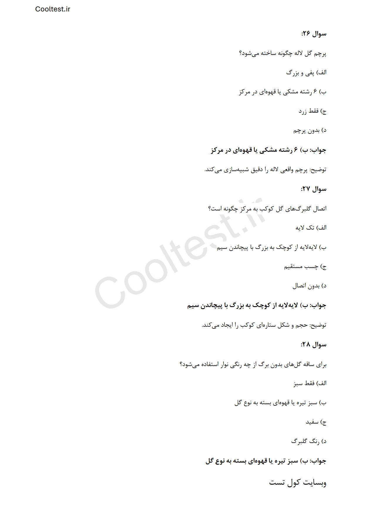 سوالات اتصال بخش ها، پرچم، ساقه و پایه گل