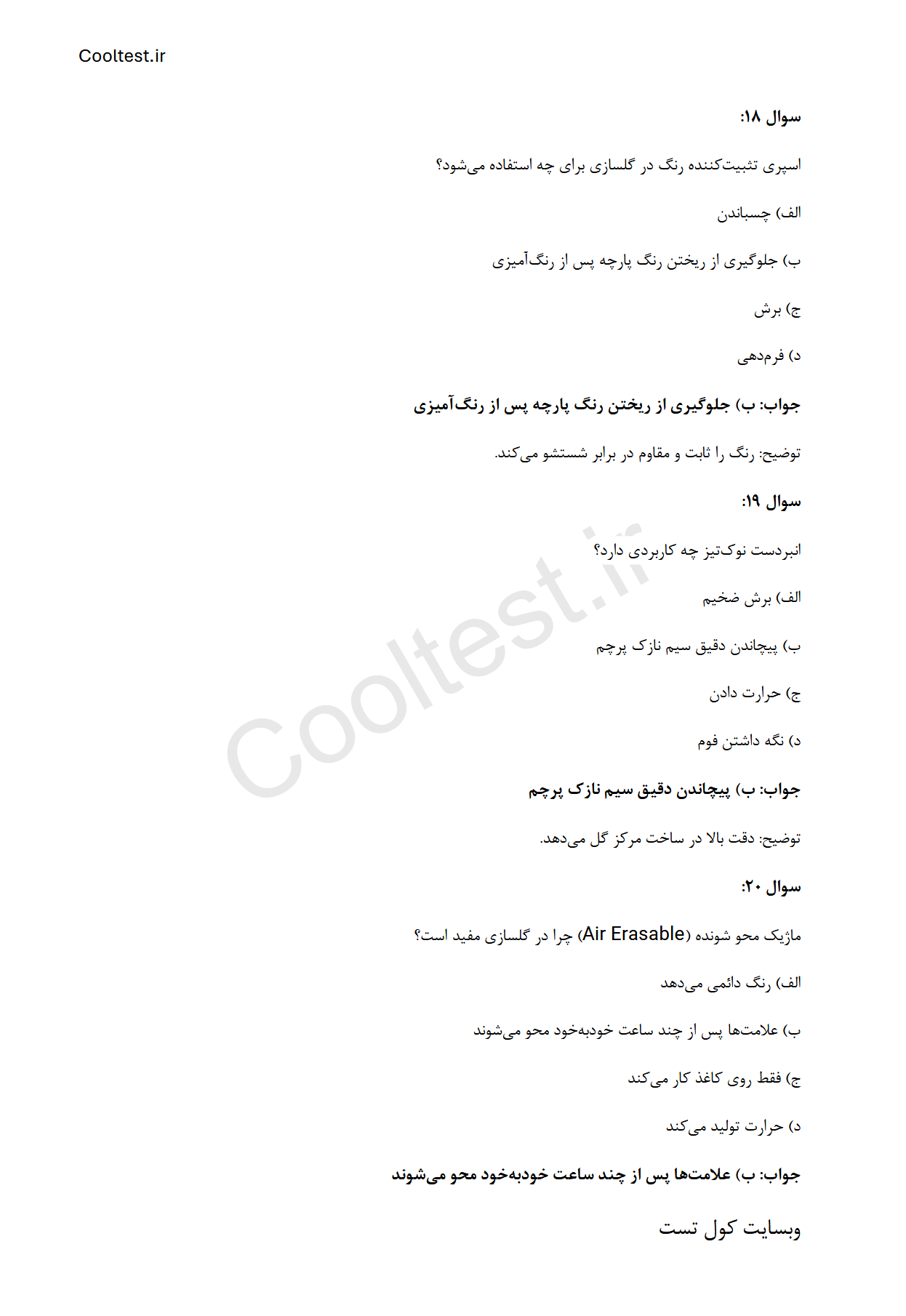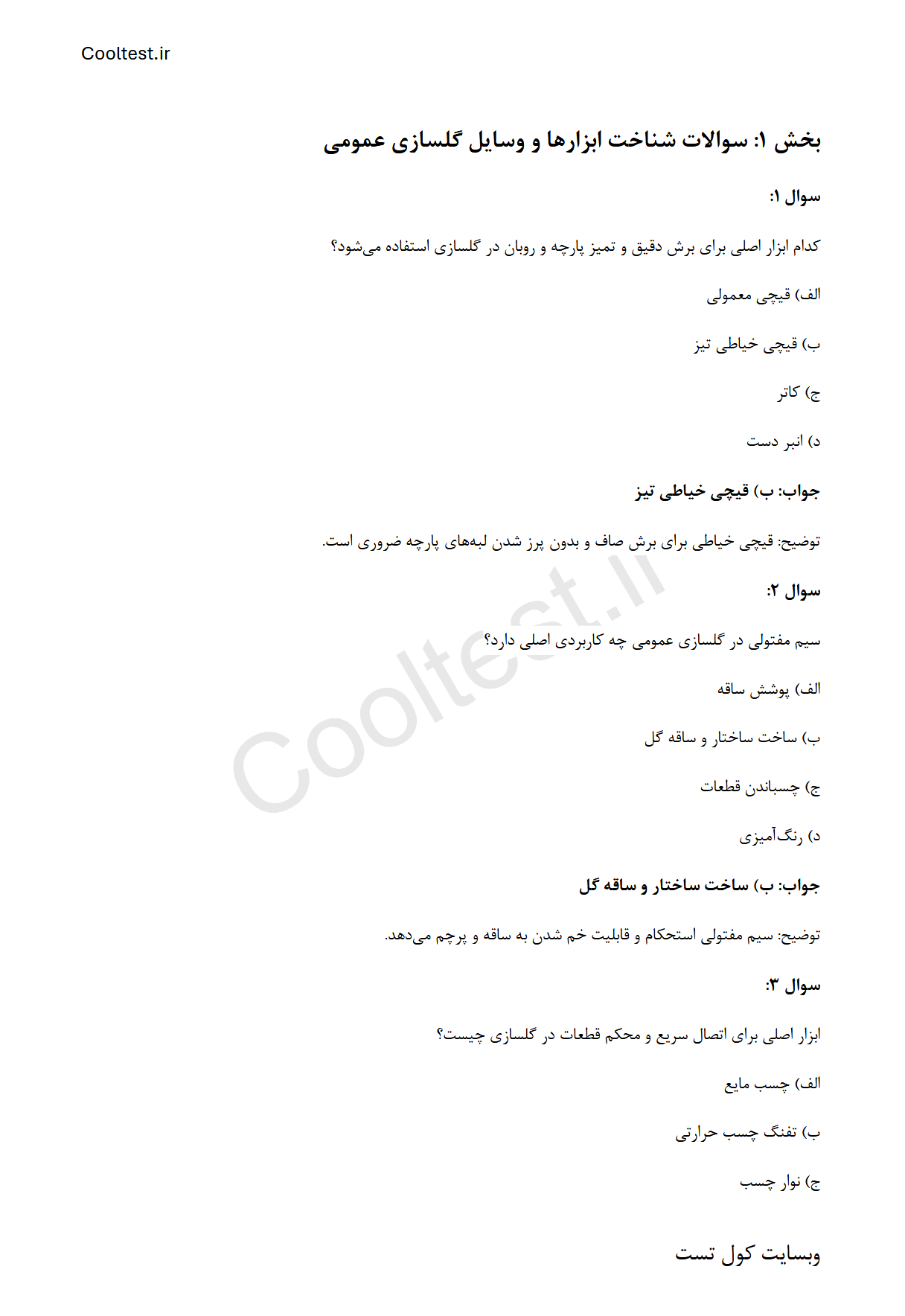 بخشی از سوالات گلسازی عمومی با جواب در قالب PDF رایگان در دسترس است تا داوطلبان پیش از تهیه نسخه کامل، کیفیت و سطح سوالات را بررسی کنند.