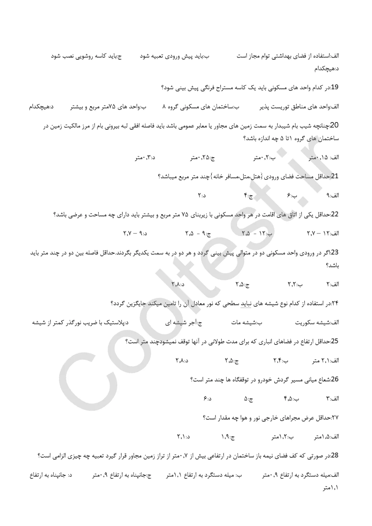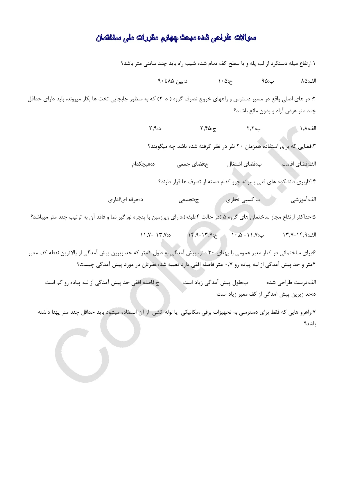 نمونه سوالات مقررات ملی ساختمان مبحث ۴ 1404 بهصورت کامل و جامع تهیه شدهاند. این مجموعه شامل ۲۵۰ سوال به همراه پاسخهای تشریحی است که به شما در آمادگی برای آزمونهای مرتبط با مقررات ملی ساختمان کمک میکند. موضوعات پوشش داده شده شامل اصول کلی مقررات، استانداردهای فنی، الزامات ایمنی و بهداشت، مدیریت پروژههای ساختمانی، و فناوریهای نوین در ساختمانسازی میباشد. با مطالعه این سوالات، میتوانید دانش و مهارتهای خود را ارزیابی کرده و به بهترین شکل برای آزمون آماده شوید.