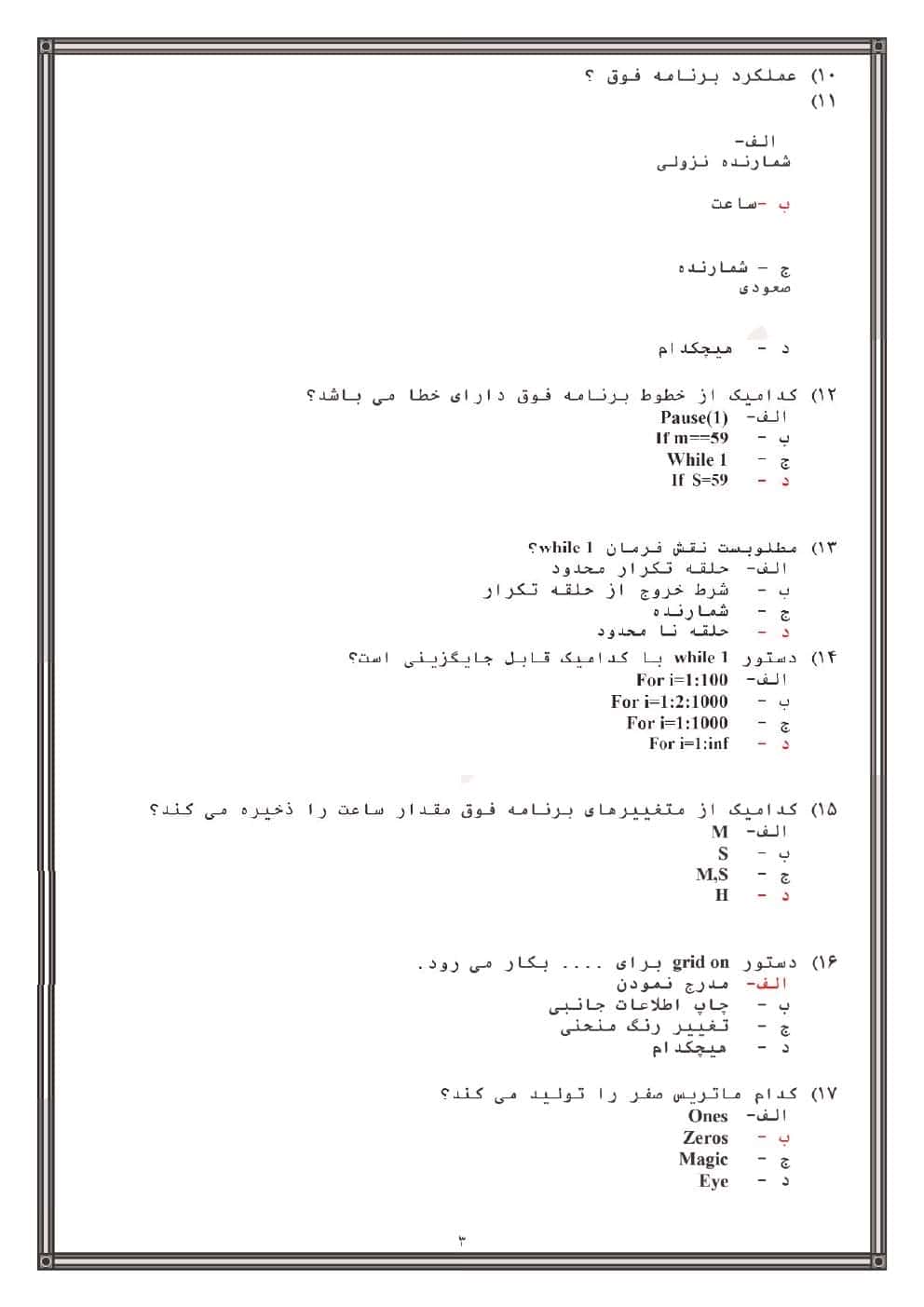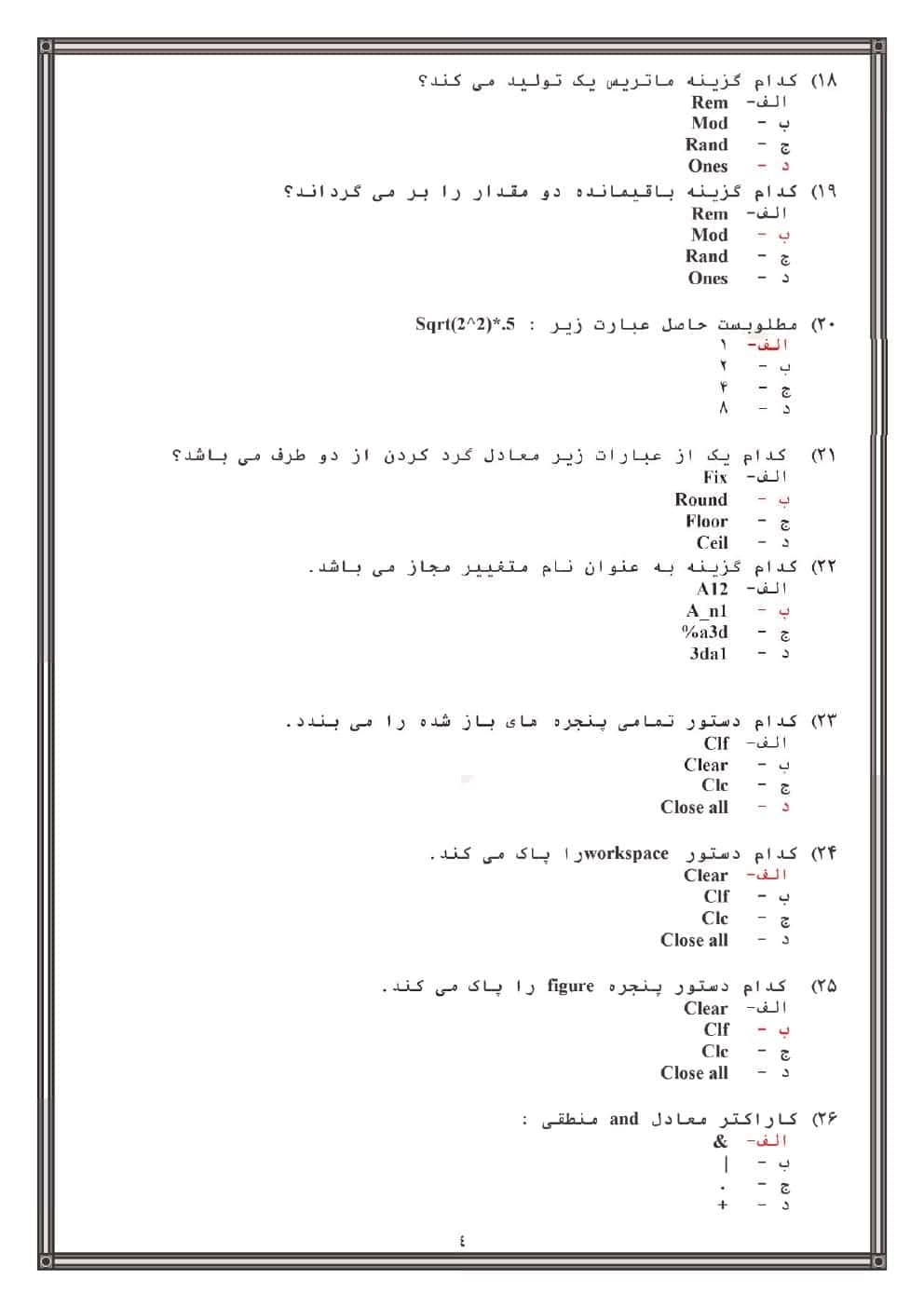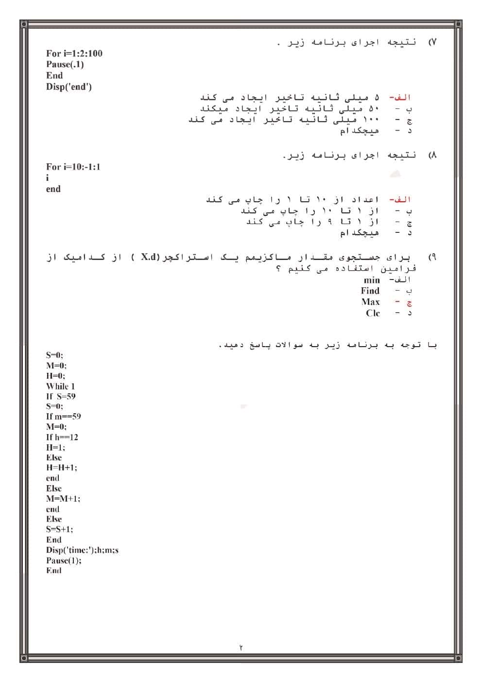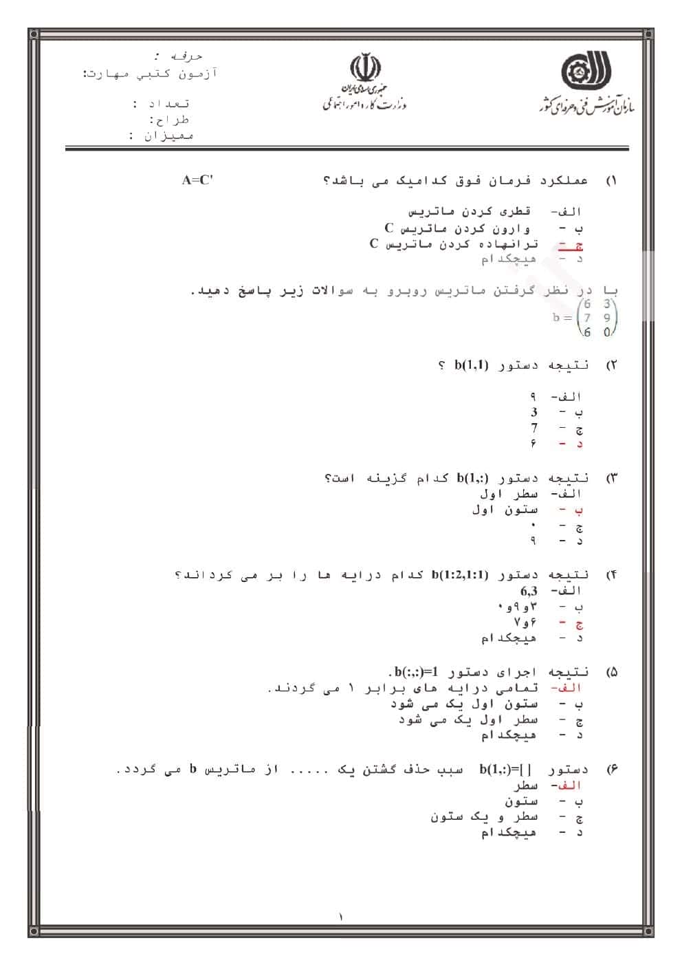 برای قبولی در آزمون Matlab فنی حرفه ای 1404، مطالعه نمونه سوالات پرتکرار و استاندارد به همراه پاسخنامه تستی و تشریحی ضروری است. این نمونه سوالات برگرفته از آزمون های سال های گذشته و مطابق با استاندارد های سازمان فنی حرفه ای میباشند و به داوطلبان کمک میکنند تا با ساختار آزمون و نوع سوالات آشنا شوند.